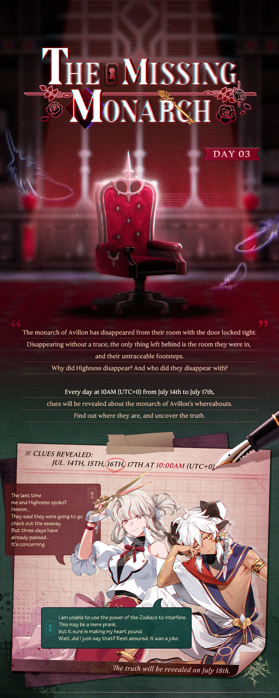 1. Uncover the hidden truth behind the monarch's whereabouts.
