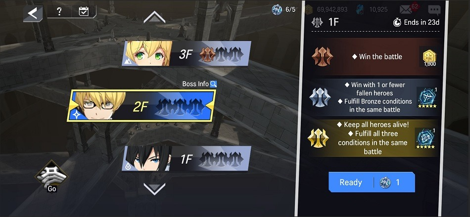 > Every floor has conditions for obtaining Gold/Silver/Bronze, and you must complete the floor according to those conditions to achieve rewards.