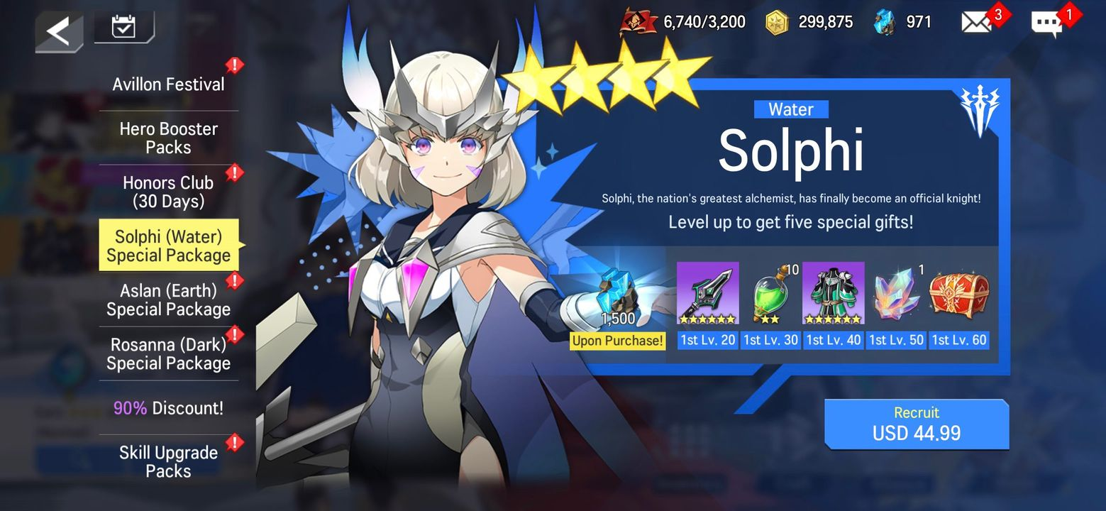 - Solphi(Water) can be recruited by purchasing a Hero Special Package.