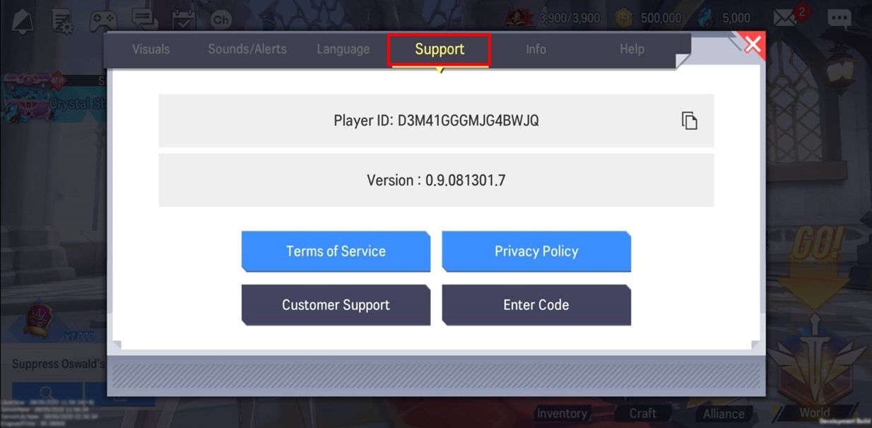 2) [Support] → [Enter Code] at the upper left side of the game screen