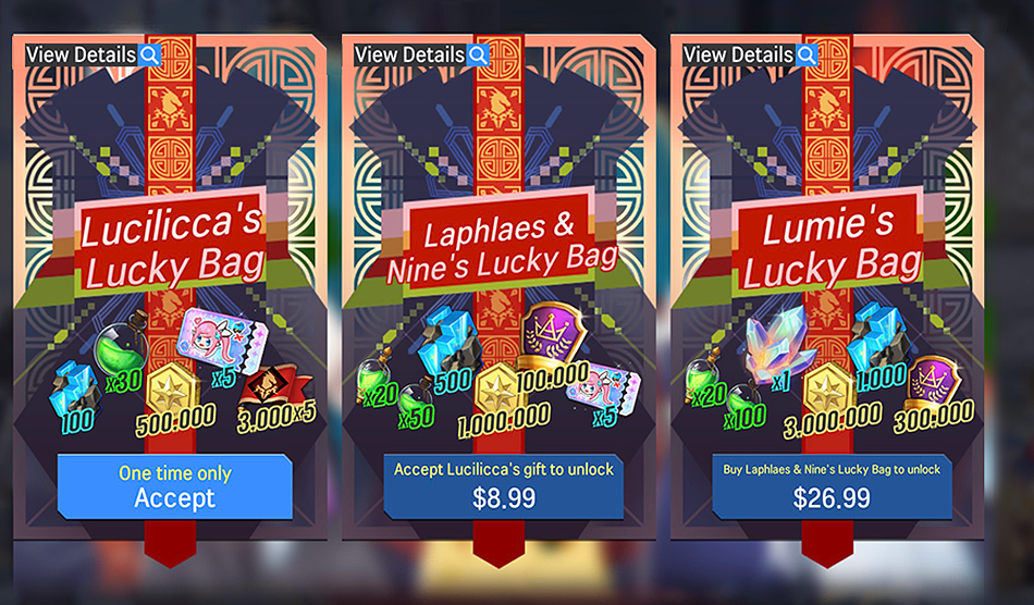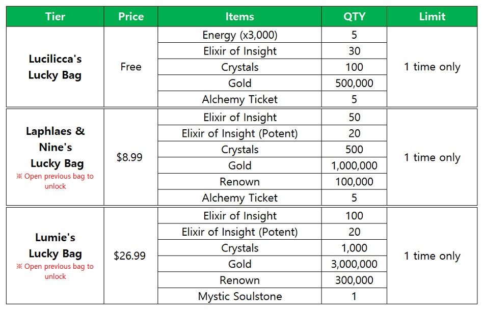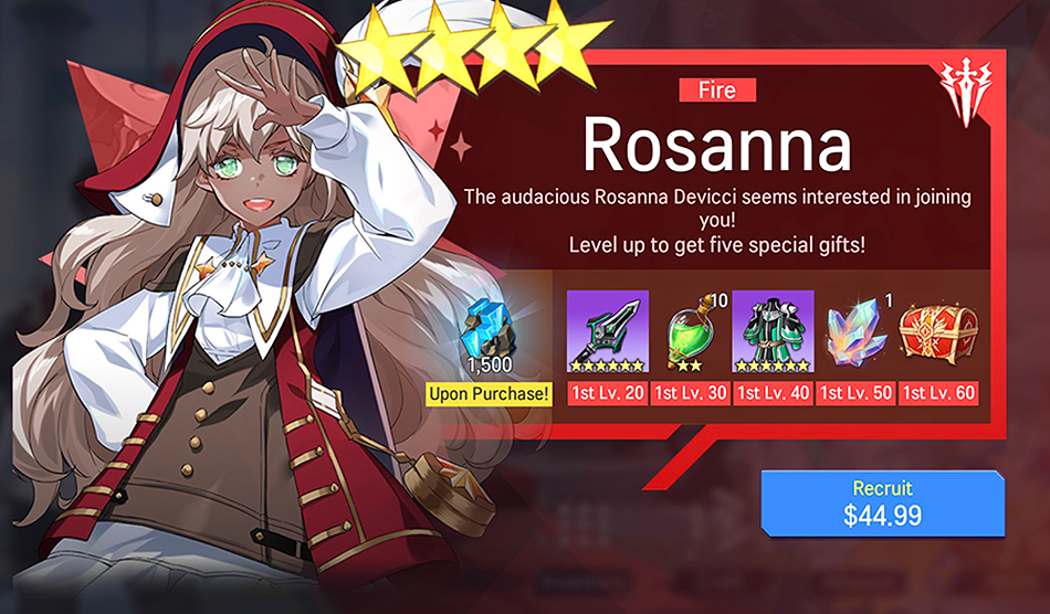 - Details: A special package including a hero Rosanna(Fire) and various rewards you can obtain by achieving the required hero levels.