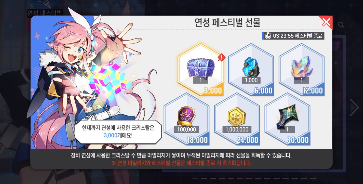 - Mileage points will be accumulated by consuming crystals for the Alchemy, and based on the accumulated points, you can acquire various rewards.