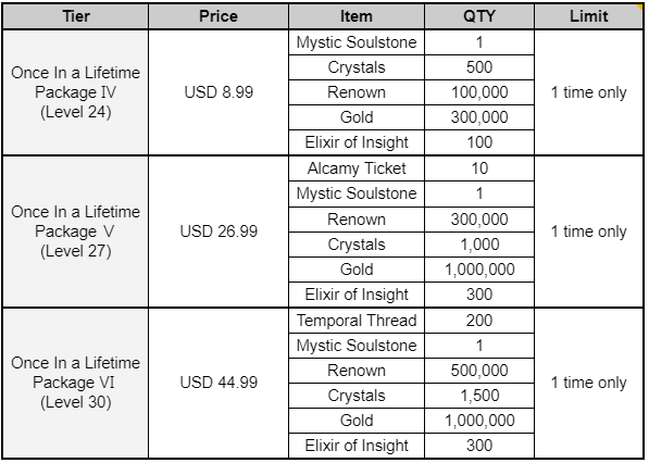 - If the Lord level is the same or higher than the given level conditions of the last package, the package product will be exposed on the first game access (enter the lobby).