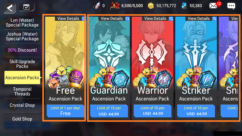4) The Ascension Packs for all 5 Classes have been set into a single screen.