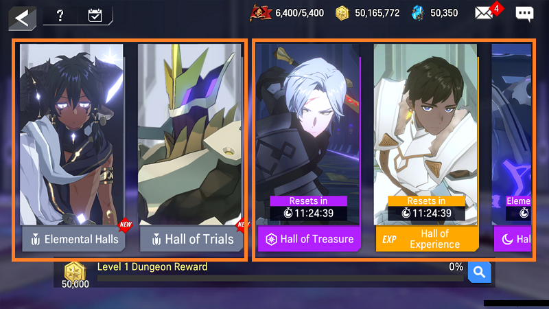 - The time remaining until Treasure/Experience Hall resets is indicated.