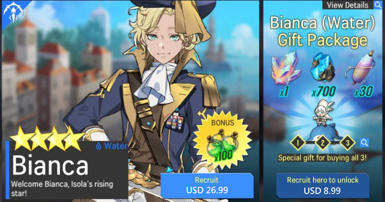 - [Water] Bianca is able to recruited by purchasing New Hero Package