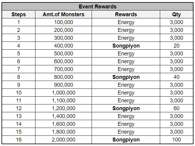 - The remained hunting medals are automatically switched to 500 Gold per Songpiyon when the event is ended.