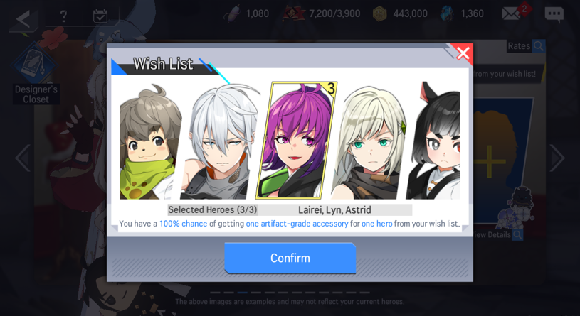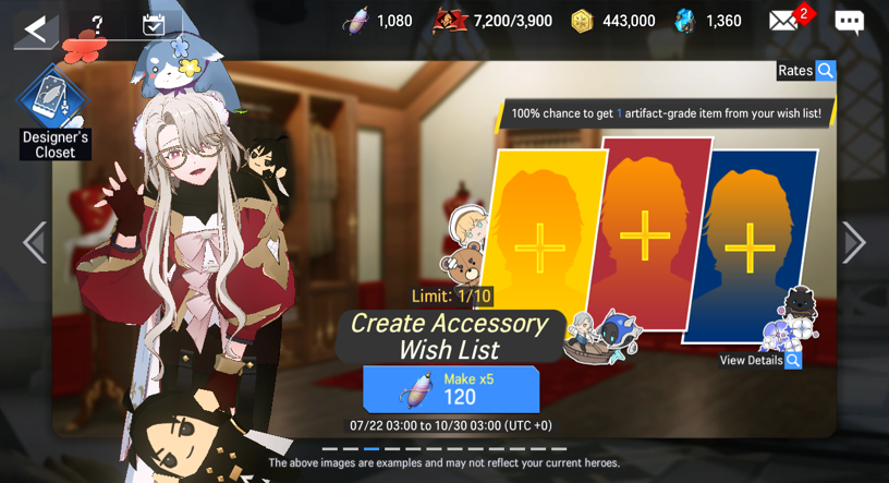 -With the Accessory Wish List, players can obtain at least 1 Artifacts-grade accessory of one of the three Heroes on the Wish List for 100%