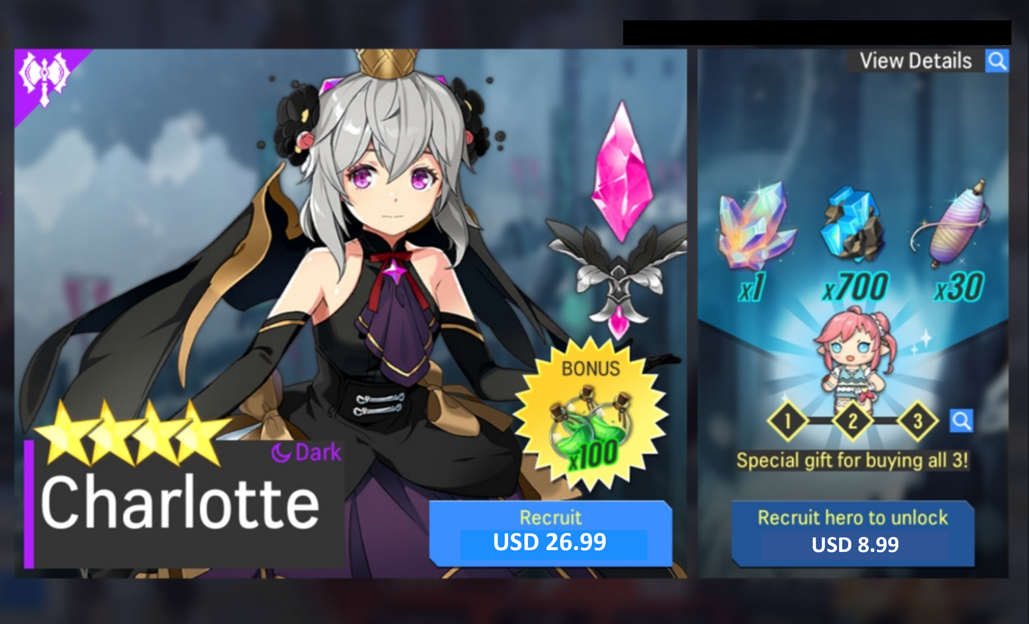 - Recruit [D] Charlotte by purchasing Hero Recruitment Package in Shop