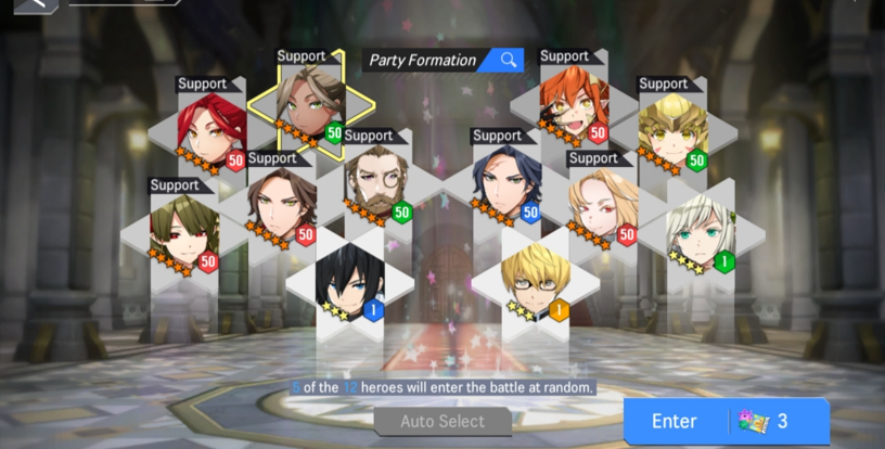 - Five random heroes from twelve dispatch heroes of Party Formation will be selected to fight against the Pumpernel. Selected Heroes will battle only using normal attacks and skills to fight quickly.