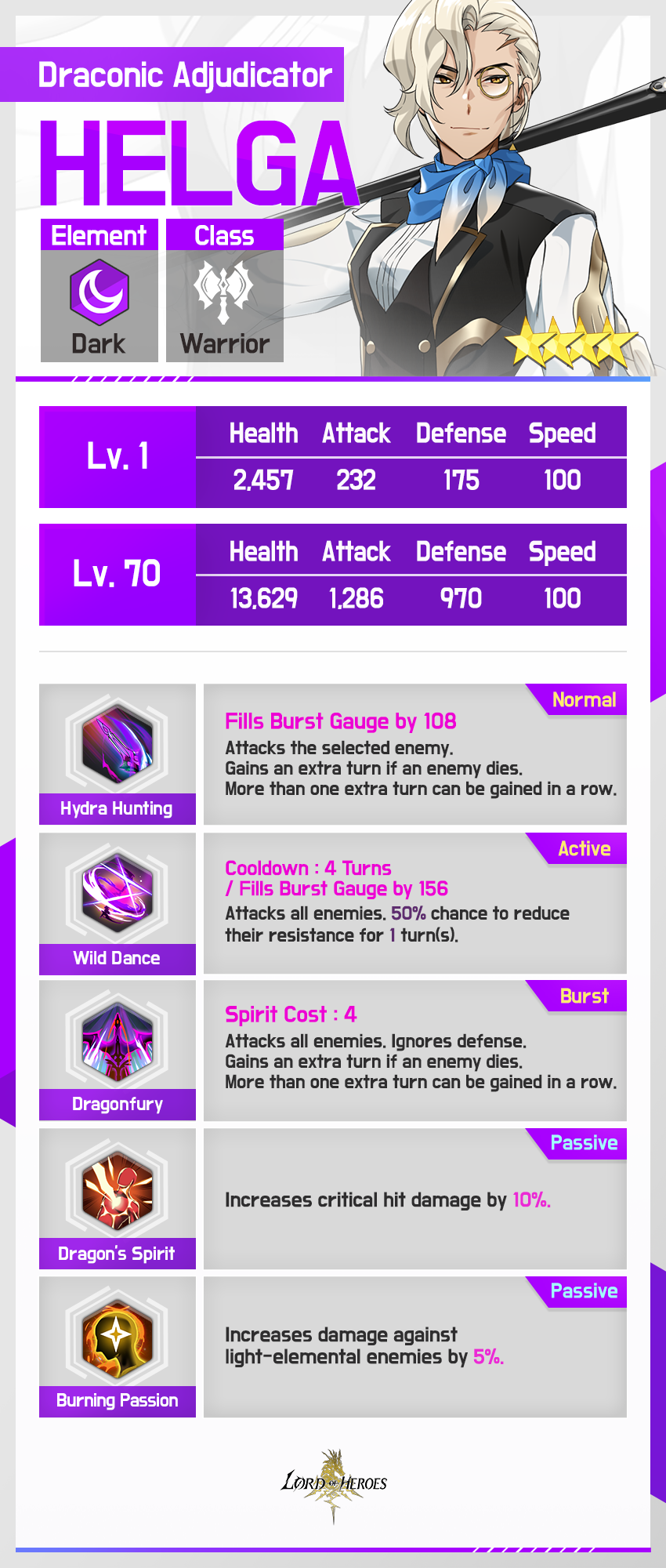 A professional huntress of evil dragons. Corrupted dragons are mighty and cunning, but can be dispatched with relative ease by one who is more cunning. When slaying a dragon, Helga plunges her spear into its heart so that her weapon may absorb the dragon's power and grow even stronger. As for why she hunts only dragons, no one really knows.