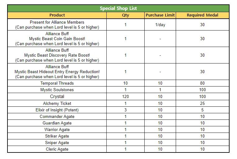 ※ Players' Lord level must be at least 5 or higher to purchase 'Alliance Buff' and 'Presents for Alliance Members' from the Special Shop.