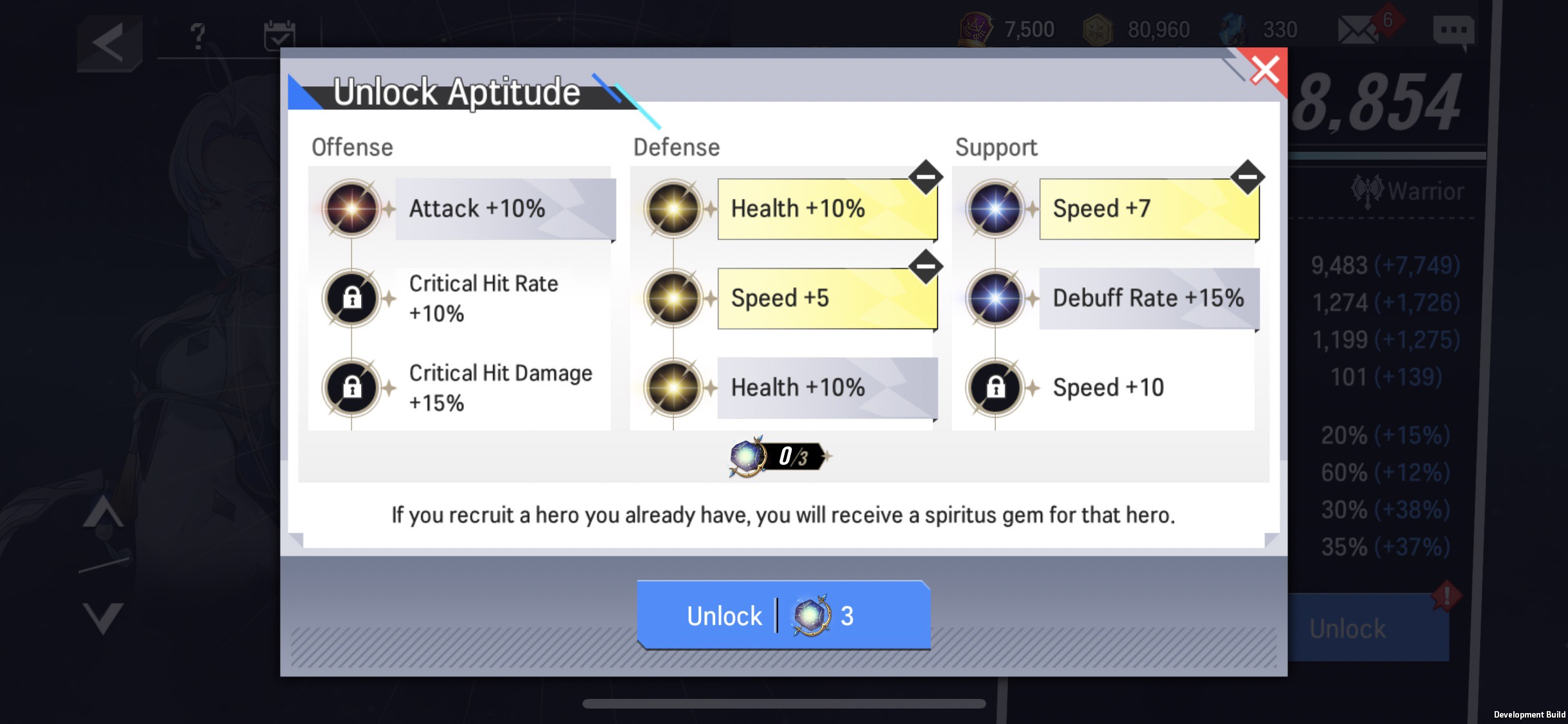 - Only 3 Aptitudes can be unlocked for each Hero. Players can select aptitudes in three different types, Offense / Defense / Support Aptitude.