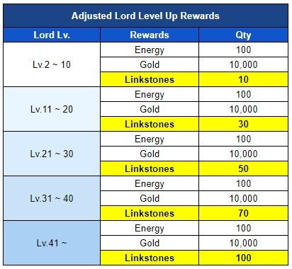 ※ All players who already received the level-up rewards, ‘Linkstones’ will be applied retroactively depending on the players' Lord level, and will send the Linkstones through the [Mail].