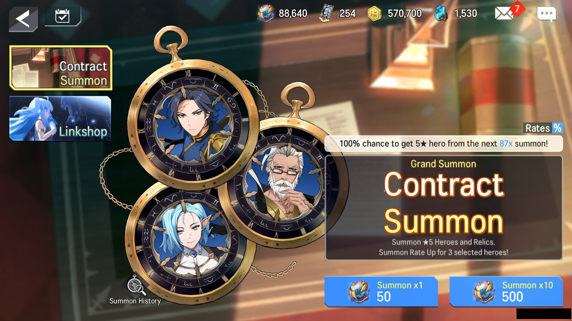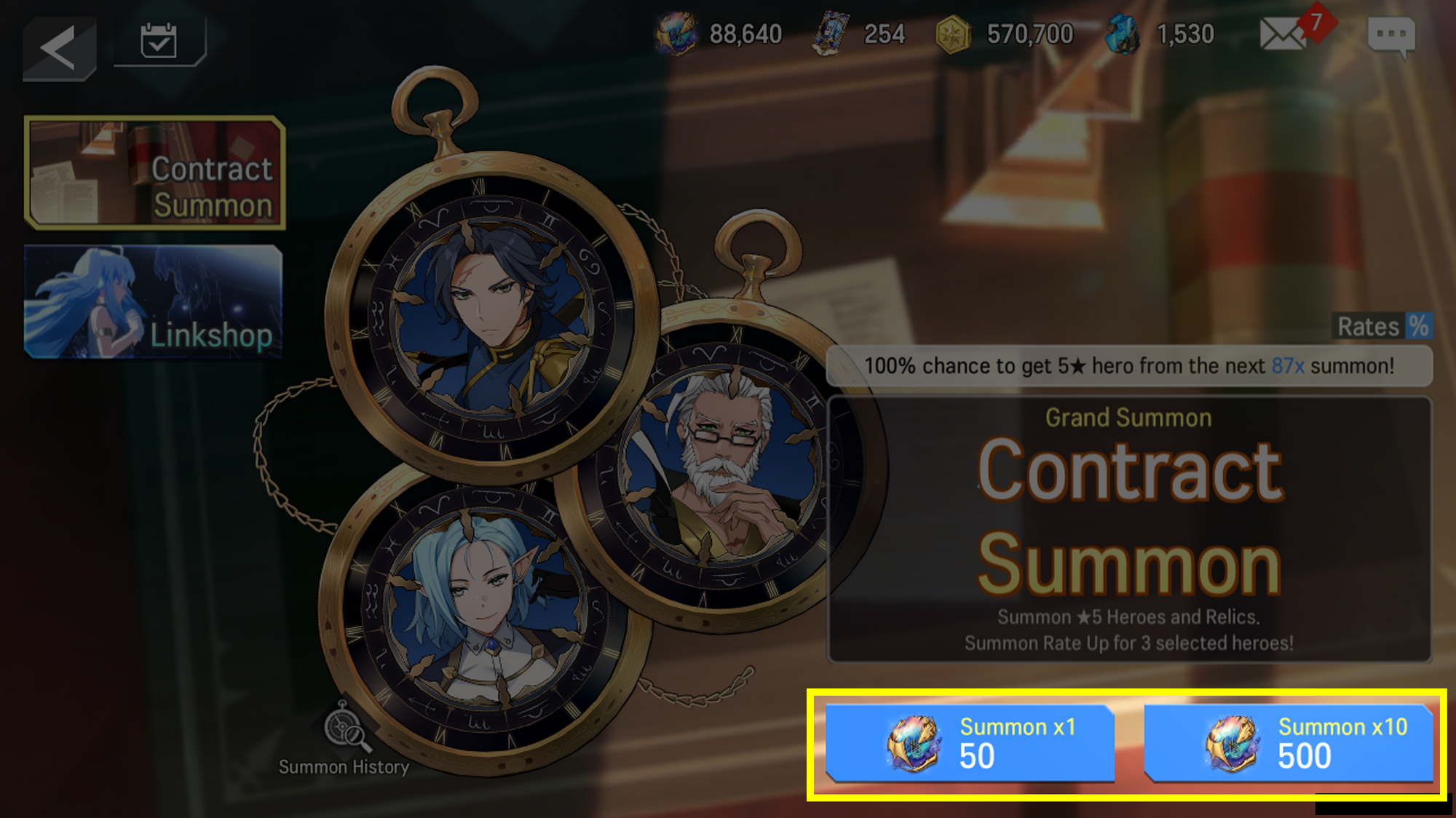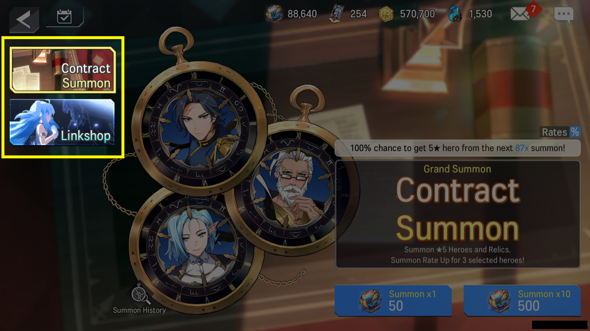 - ‘Contract Summon’ is a ‘Selective Summons’, where three Heroes from the summoning list that are selected by the player will have a higher summoning rate than other Heroes.