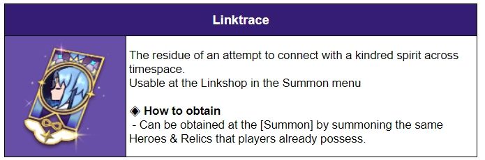 - Once summoned Heroes' Aptitude and Relic's Experience have reached the maximum, they will receive doubled Linktrace instead of the Spiritus Gem and Relic's Exp.
