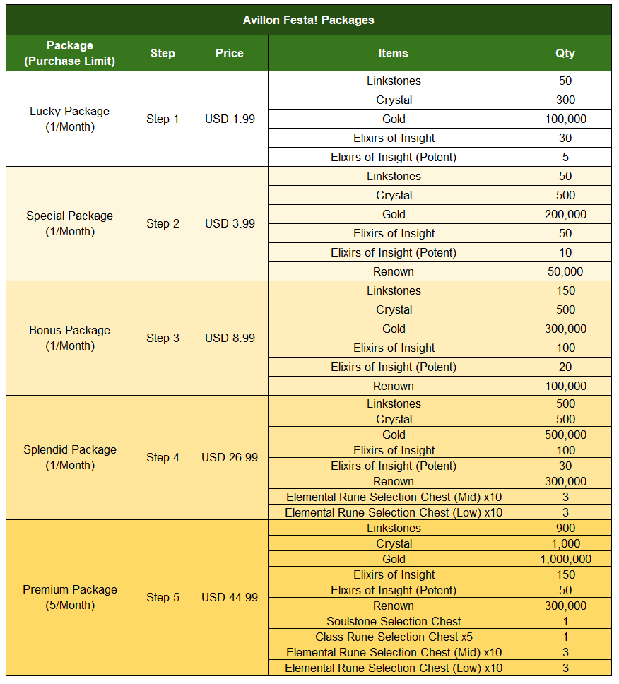 - Packages that are end of sales: 5 Avillon Festival Packages (Lucky Package / Special Package / Bonus Package / Splendid Package / Premium Package)