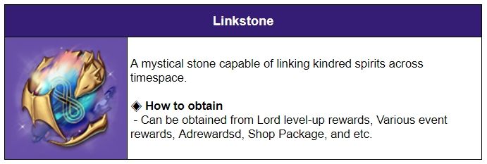 - Crystal, which is one of the reward from the Lord Level-up Reward, will be changed to the ‘Linkstone’.