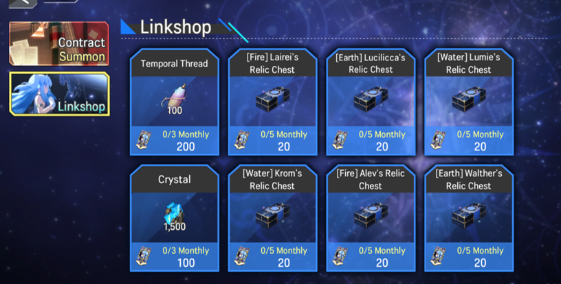 1) Through the tabs located on the left side of the screen, the players can find the tabs of summoning that are currently available to proceed, and a tab to enter the mileage shop called ‘Linkshop’.
