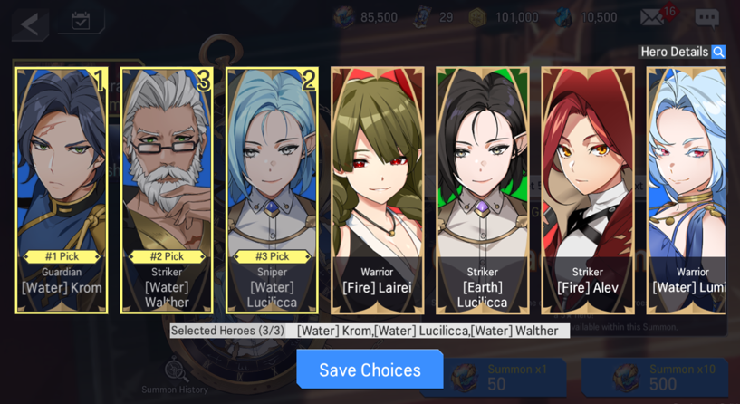 - Recruitable Heroes: [F] Lairei / [F] Alev / [F] Krom / [F] Lumie / [F] Nine / [W] Krom / [W] Walther / [W] Lucilicca / [W] Lumie / [W] Baretta / [E] Walther / [E] Lairei / [E] Alev / [E] Solphi / [E] Lucilicca
