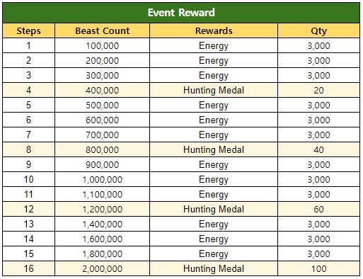 - The remaining hunting medals are automatically switched to 500 Gold per medal when the event ends.