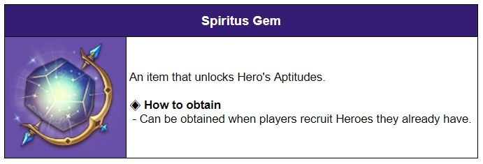 - When players recruit the same Hero again, players will obtain a 'Spiritus Gem' which will enhance the Hero's Aptitude.