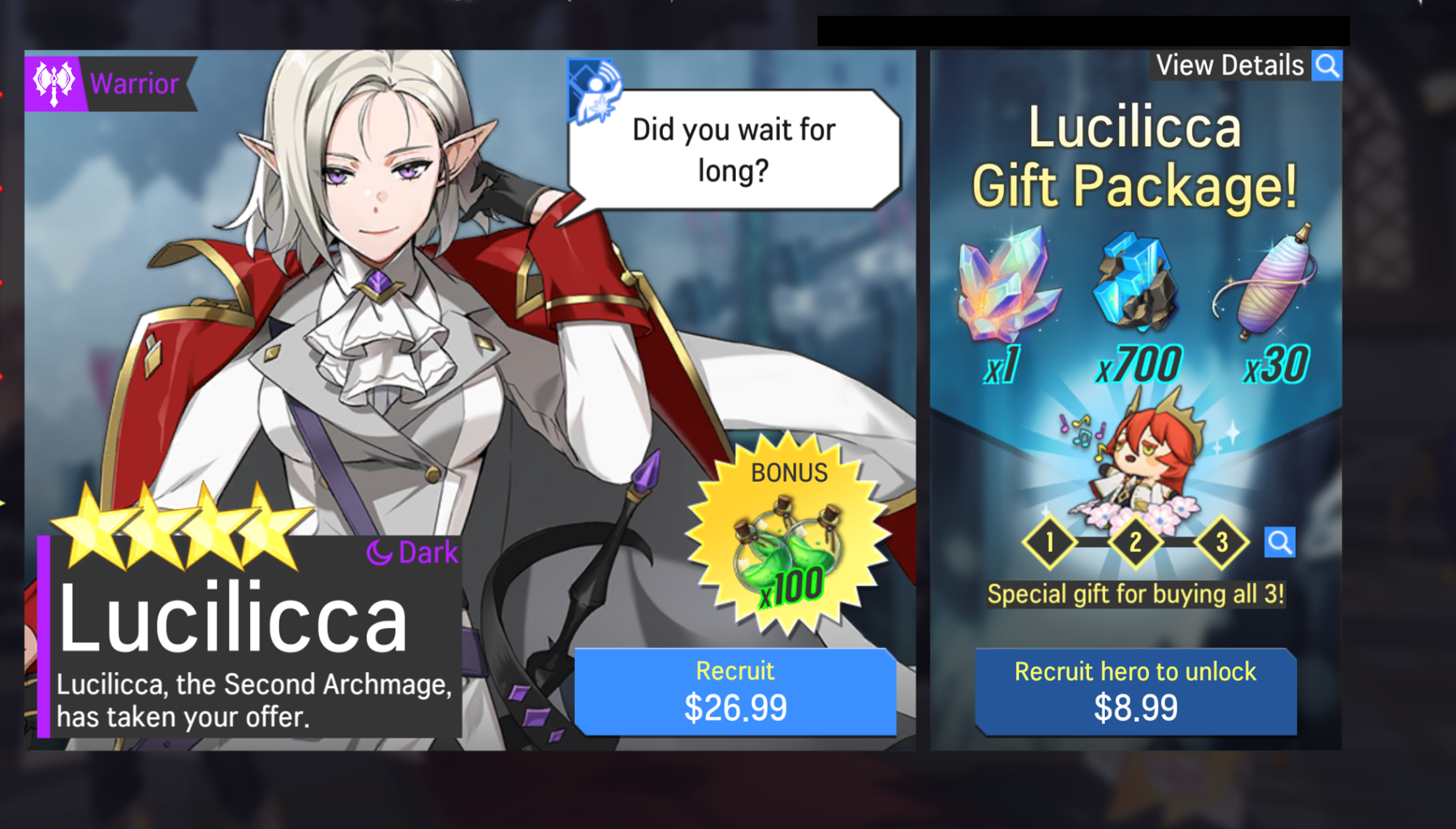 - Recruit [D] Lucilicca by purchasing Hero Recruitment Package in the Shop.