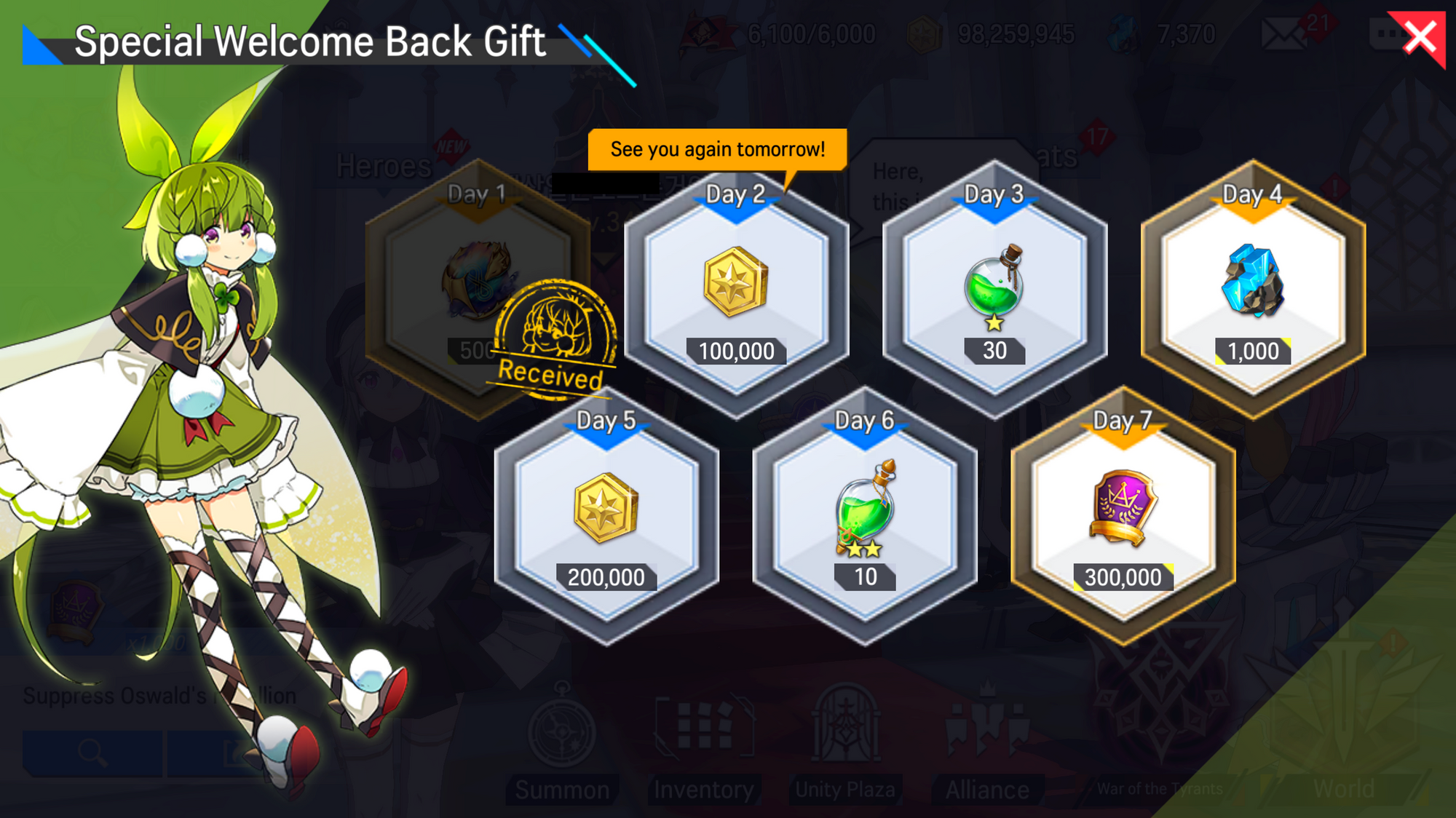 - [Special Welcome Back Gift] Event will only appear to returning users, which are players who haven’t login to the game for more than 30 days.