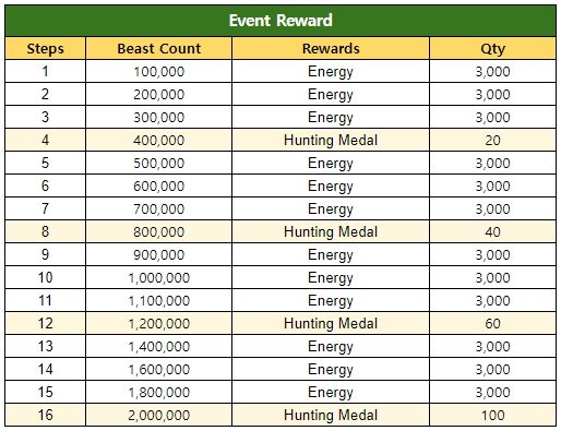 - The remaining hunting medals are automatically switched to 500 Gold per medal when the event ends.