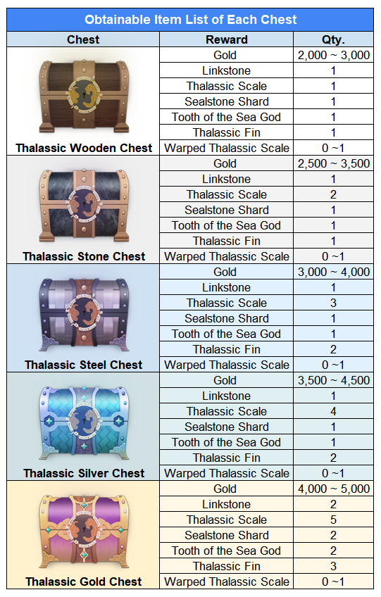 ※ Certain items can be obtained within designated possibilities, players might receive different items from the same grade of Thalassic Chest.