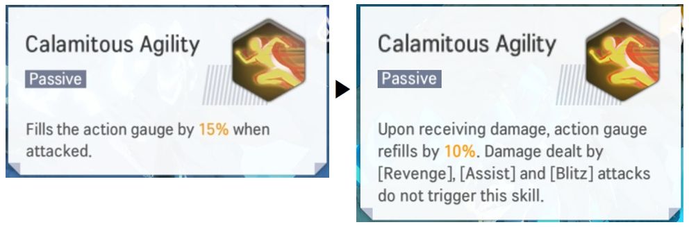 - After : Upon receiving damage, the action gauge refills by N%. Damage dealt by [Revenge], [Assist] and [Blitz] attacks do not trigger this skill.