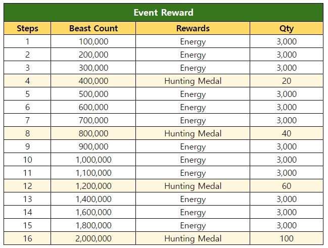 - The remaining hunting medals are automatically switched to 500 Gold per medal when the event ends.