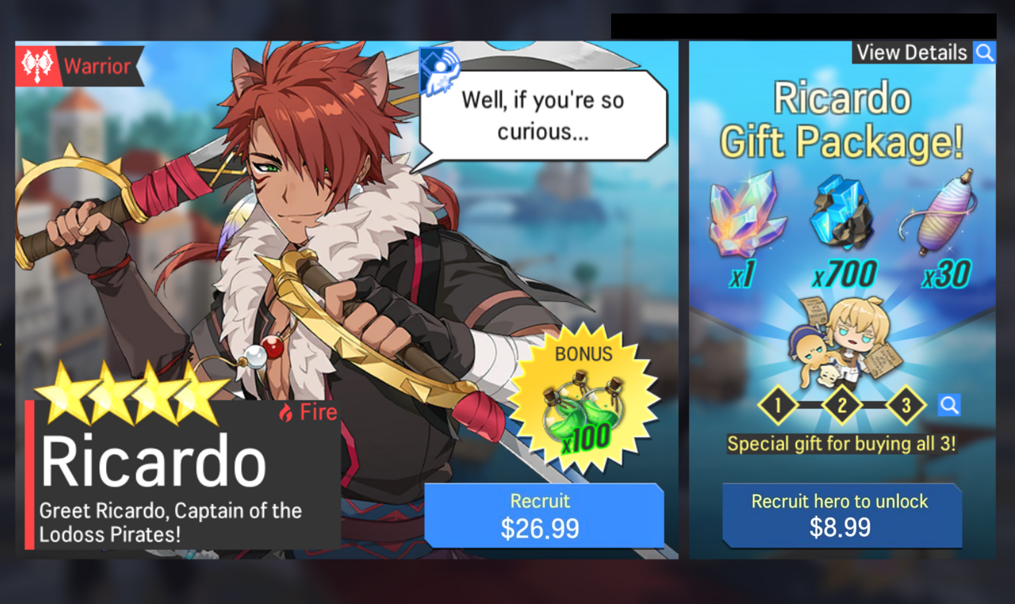 - Recruit [F] Ricardo by purchasing Hero Recruitment Package in the Shop.