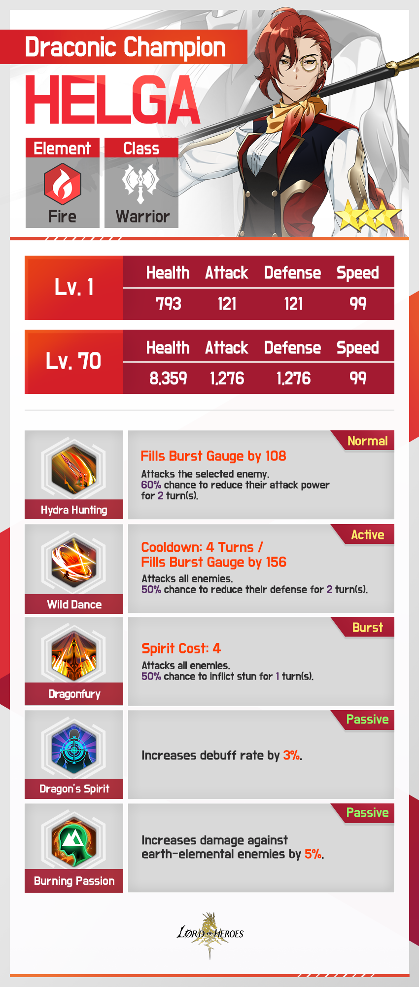 A dragon knight who earned the title of "Wyrmfire Knight" for taming a dragon. Dragons are proud beasts who almost never lower themselves to serve someone else, but Helga was able to form a soul bond with one thanks to her exceptional charisma and character. She and her dragon will be spoken of in legends for their contribution during the War of the Tyrants.