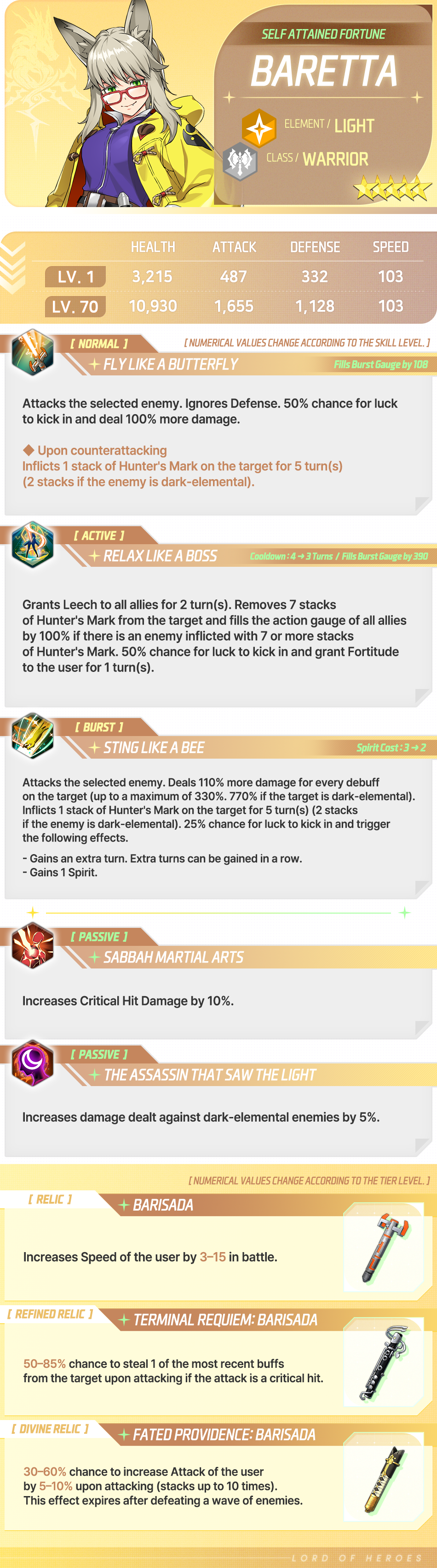 However, many people can tell you what a powerful thing luck can be when life confronts you with a crossroads. It was luck that allowed Baretta to become head of the greatest assassins' guild in the world, luck that saved her from the disaster that followed, and luck that got her a recommendation by an imperial commander. All of these things and more combine to make luck Baretta's greatest skill.