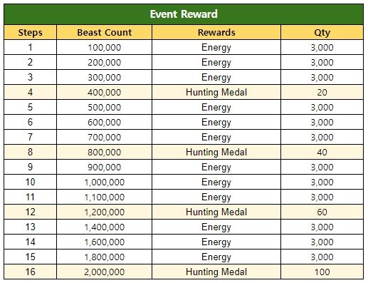 - The remaining hunting medals are automatically switched to 500 Gold per medal when the event ends.