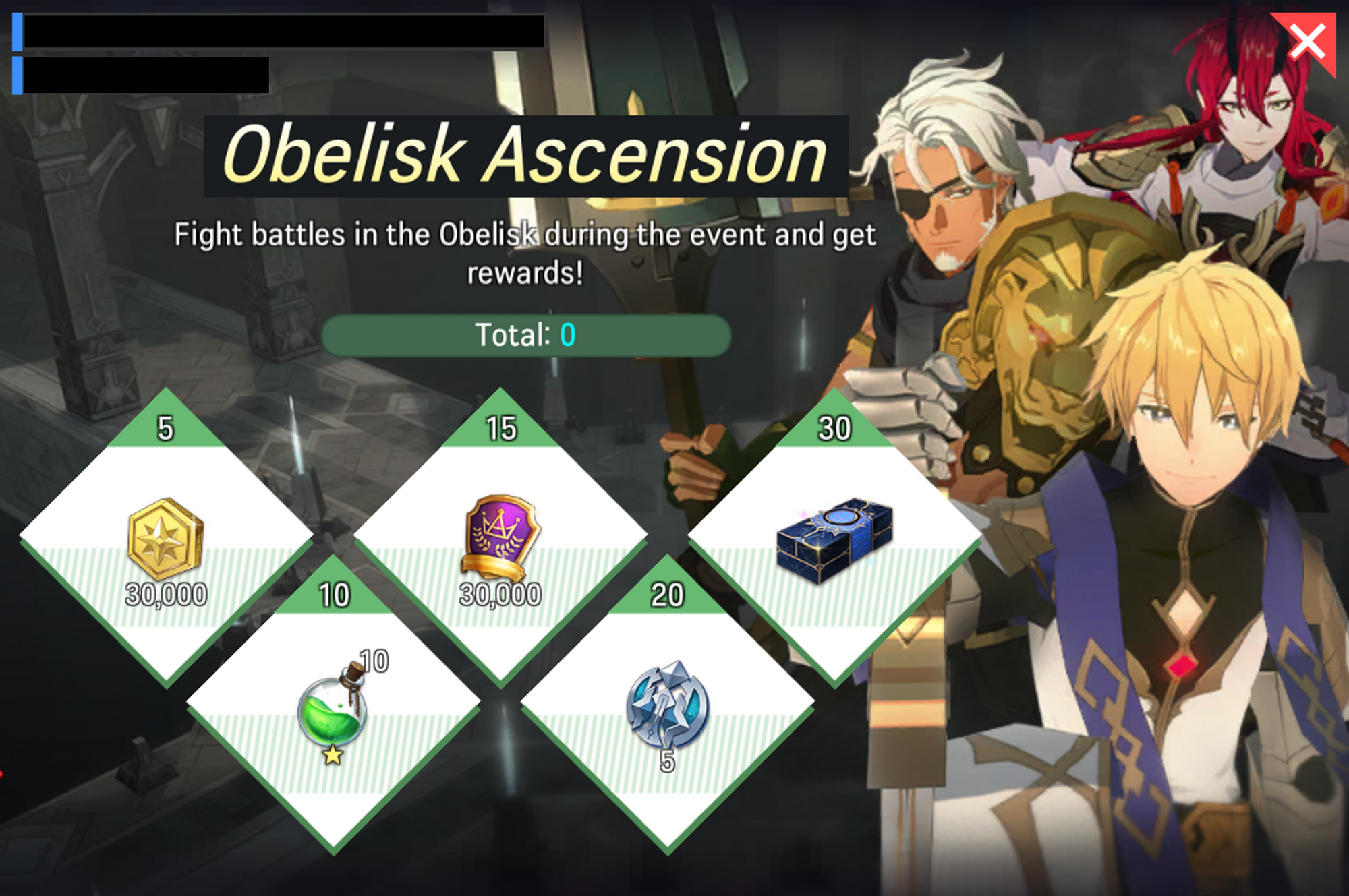 - Various rewards will be available upon the number of Obelisk played!