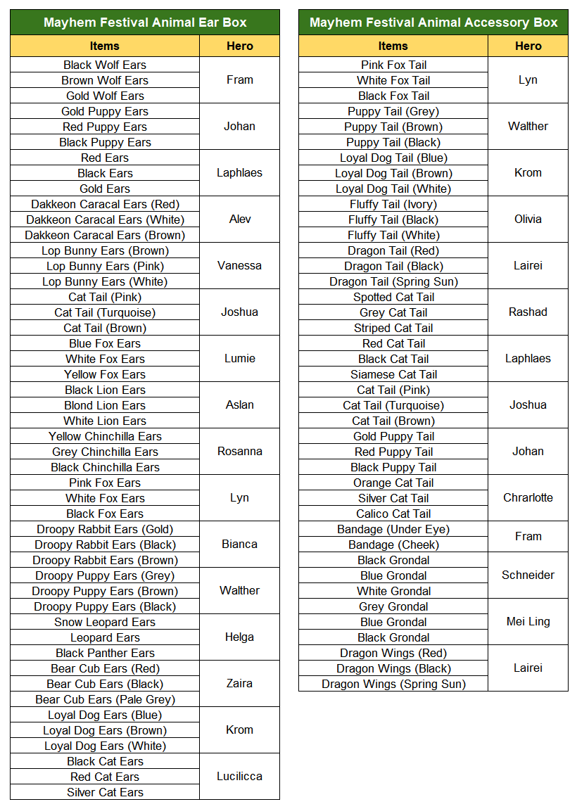 ※ Players will randomly get one of the items listed above from the Mayhem Festival Animal Ear Box / Accessory Box.