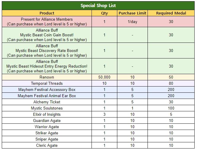 ※ Players’ Lord level must be at least 5 or higher to purchase ‘Alliance Buff’ and ‘Presents for Alliance Members’ from the Special Shop.