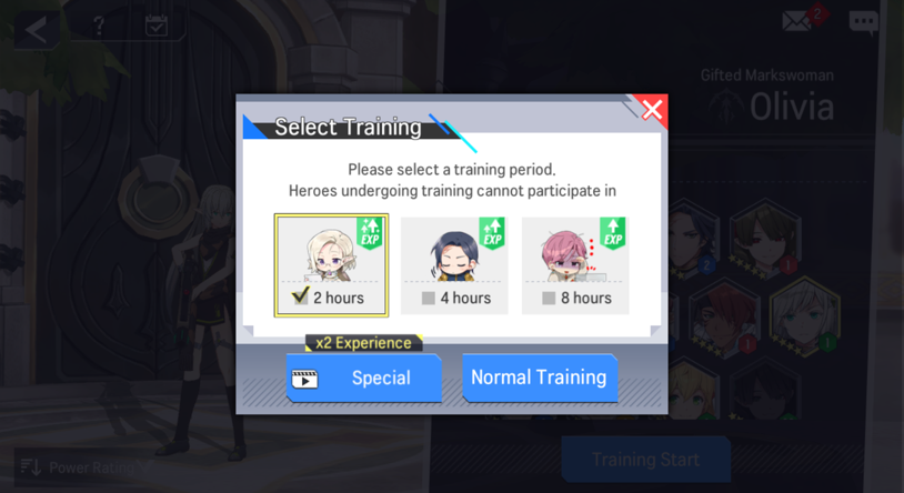 - As the Training Type, players can select either 'Special Training' OR 'Normal Training'; Players can double up the Exp with Special Training by watching Ads.