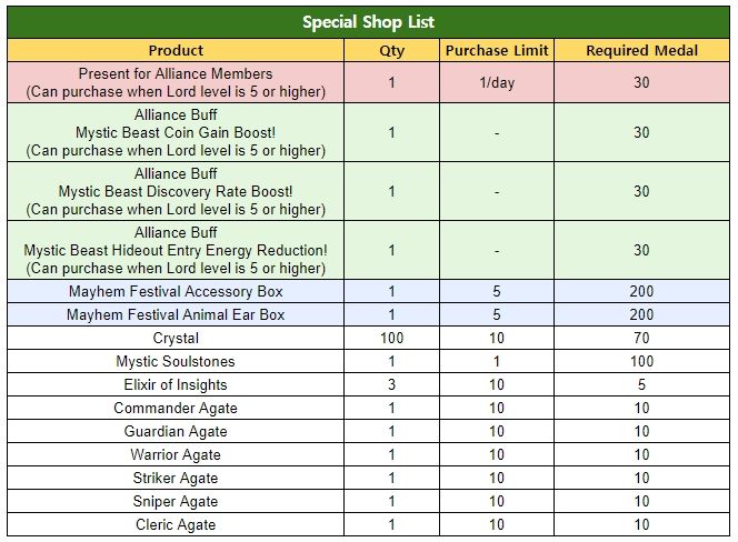 ※ Players’ Lord level must be at least 5 or higher to purchase ‘Alliance Buff’ and ‘Presents for Alliance Members’ from the Special Shop.