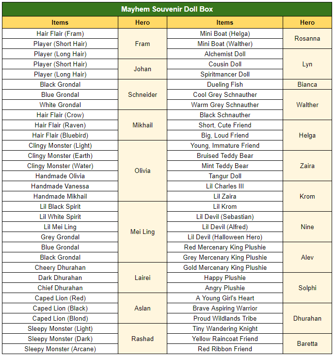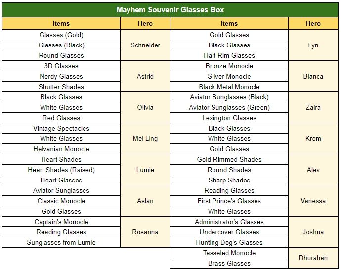 ※ Players will randomly get one of the items listed above from the Mayhem Souvenir Glasses Box / Doll Box.