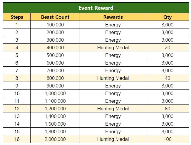 - The remaining hunting medals are automatically switched to 500 Gold per medal when the event ends.