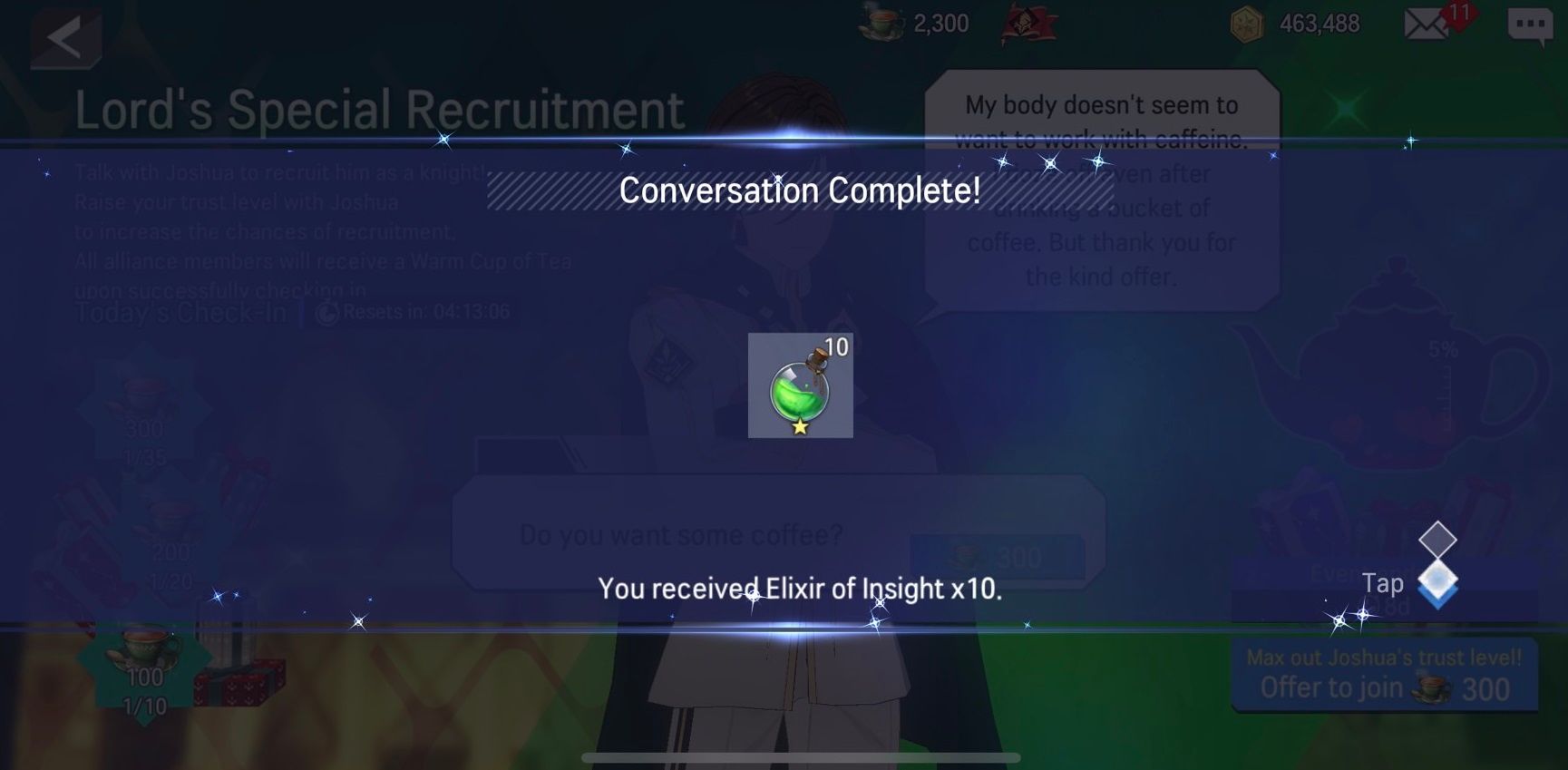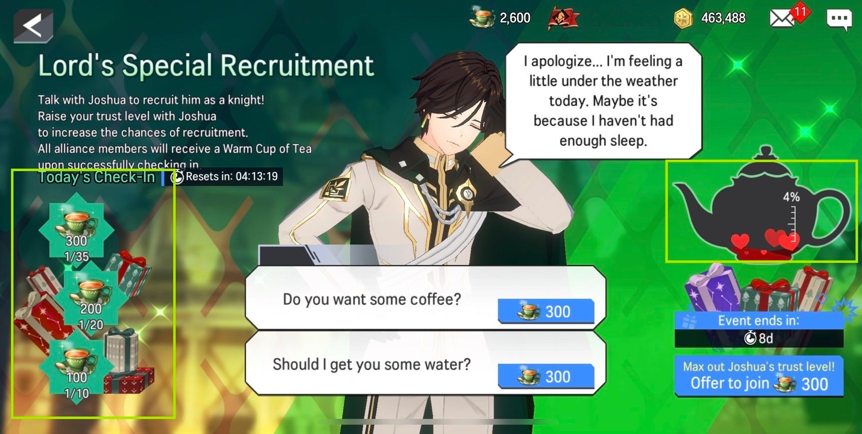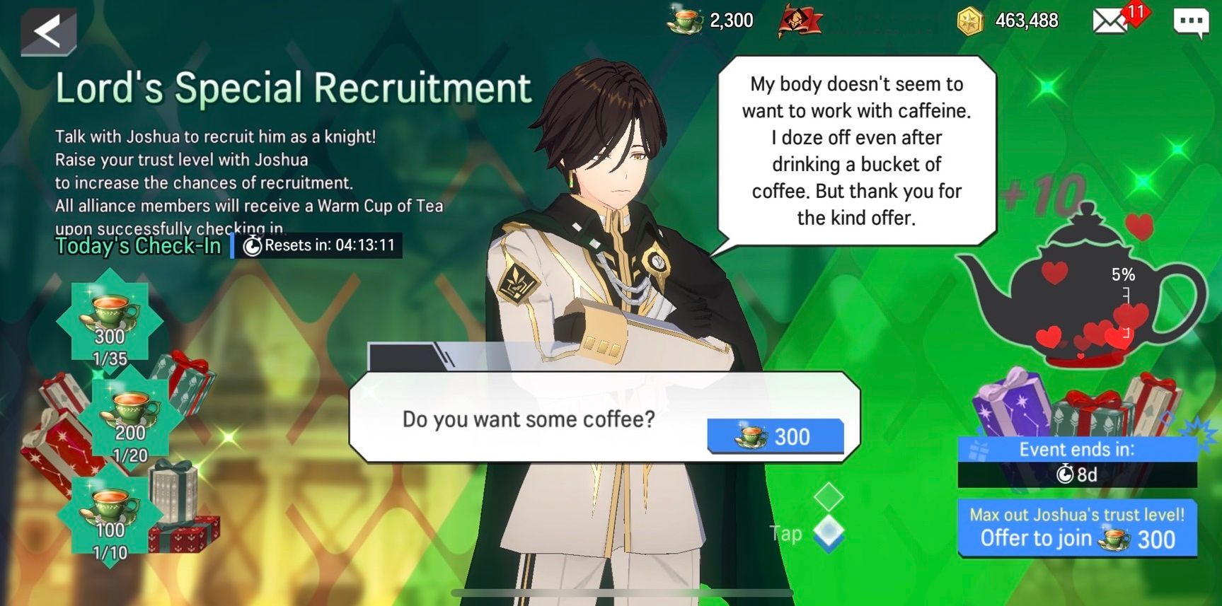 - Collect 'Warm Cup of Tea' through Alliance Daily Check-In and recruit Joshua(Earth)!