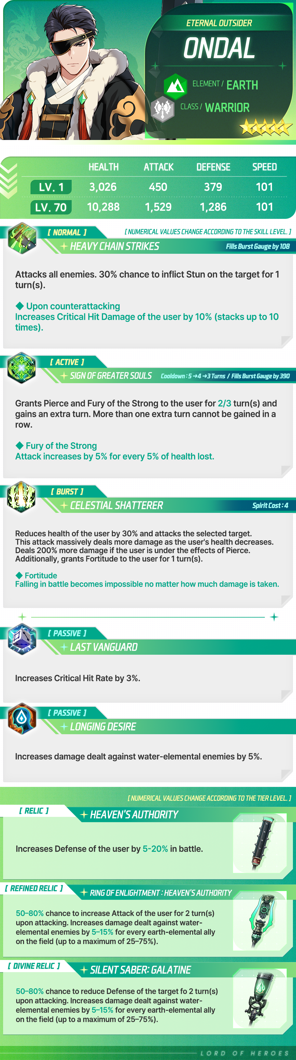 Ondal is a name somewhat difficult to get used to yet soft-sounding. This name is said to have spread from the outer reaches of the Far East to the woodlands. We'll never know if Ondal would believe it, but many of the later generations remember his spirit, deeply inspired by his heroic bravery. The story of being separated from those precious to him, struggling to find a way back to them, meeting other valuable companions, and in the end, sacrificing his life on the battlefield... His entire story is one of noble sacrifice, and deserves nothing less than the greatest merits of everlasting history—even if Ondal himself would fiercely refuse.