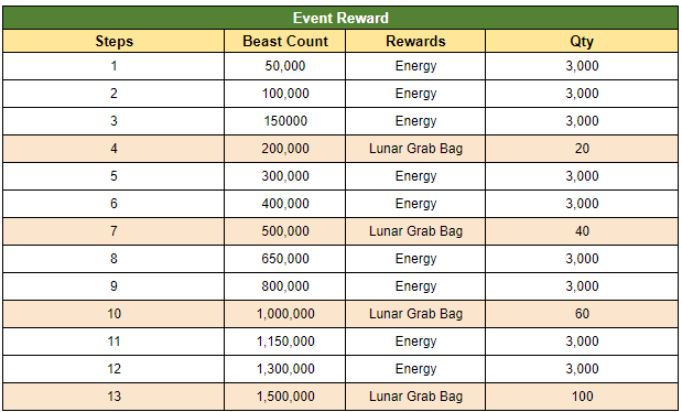 ※ The mystic beast appears in random elements, and the amount of Lunar Grab Bag dropped varies by the beast's elemental type.