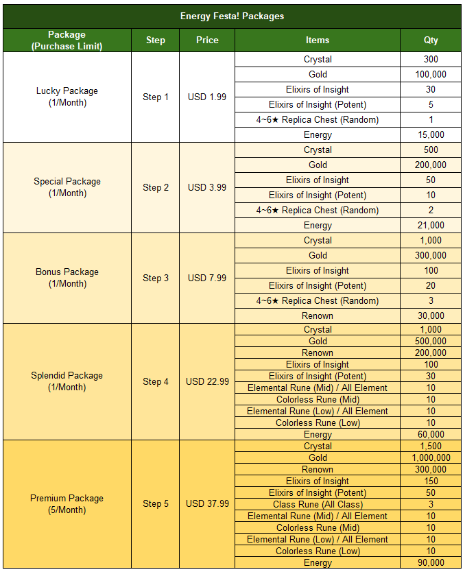 ※ When purchasing the Energy Festival Package, the previous tier must be purchased to unlock the next tier.
