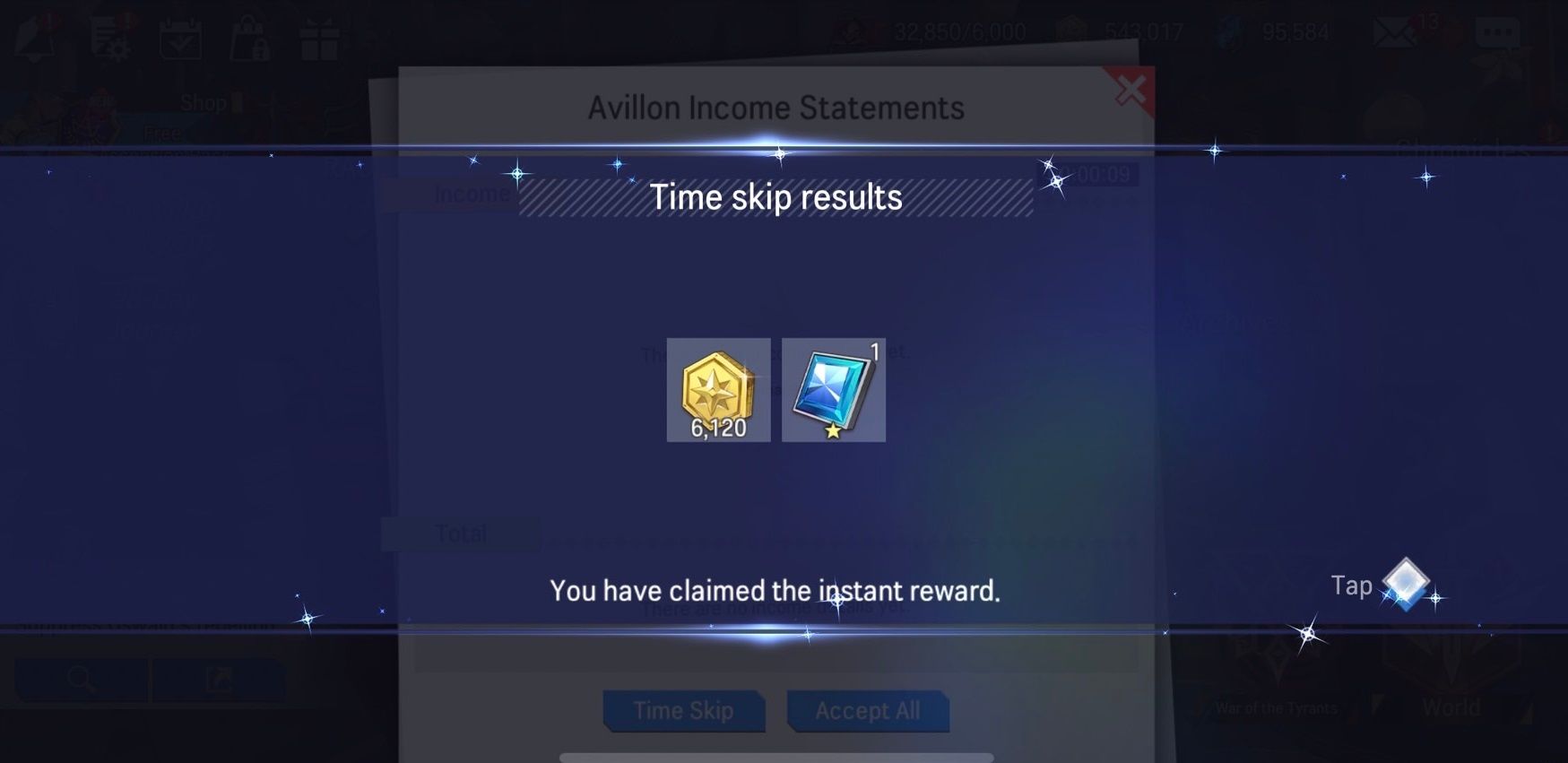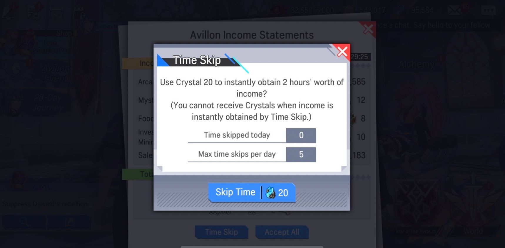 - When 'Time Skip' is used, 2 hours' worth of income can be claimed instantly.
