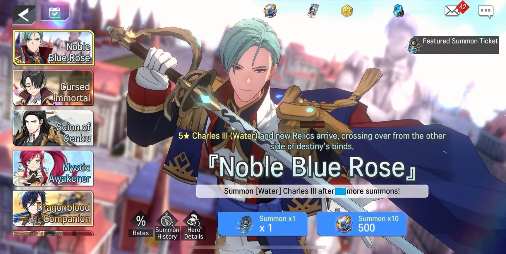 - Charles III (Water) can be recruited through 'Noble Blue Rose' Summon.