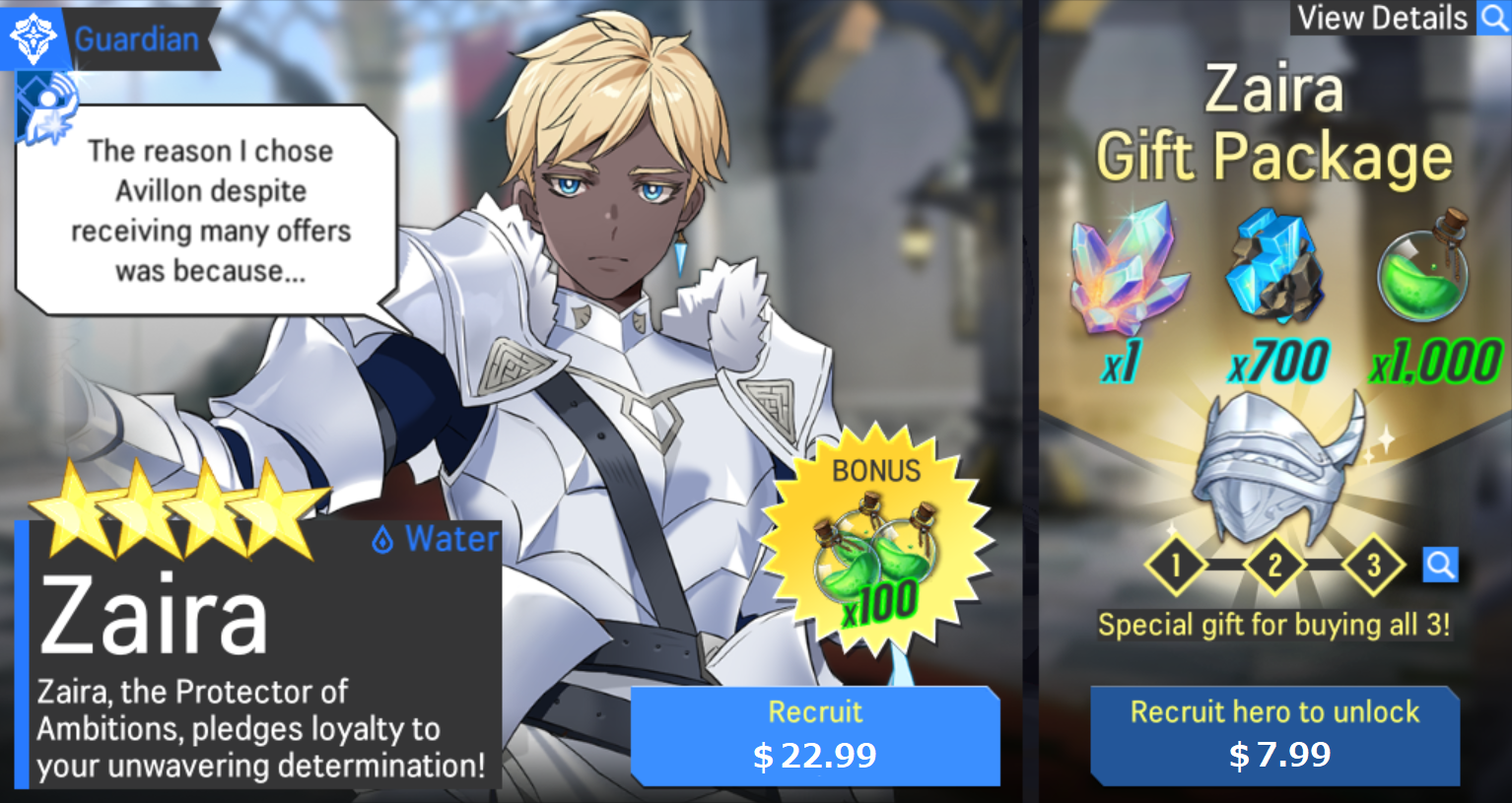 - Recruit Zaira (Water) by purchasing her Hero Recruitment Package in the Shop.